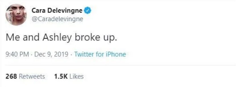 “Me and Ashley broke up,” read a tweet on Cara’s account. The two have been dating for nearly a year and have been super adorable on social media—Cara even seemingly gave a shout-out to her lady love at the TrevorLIVE Gala in June.