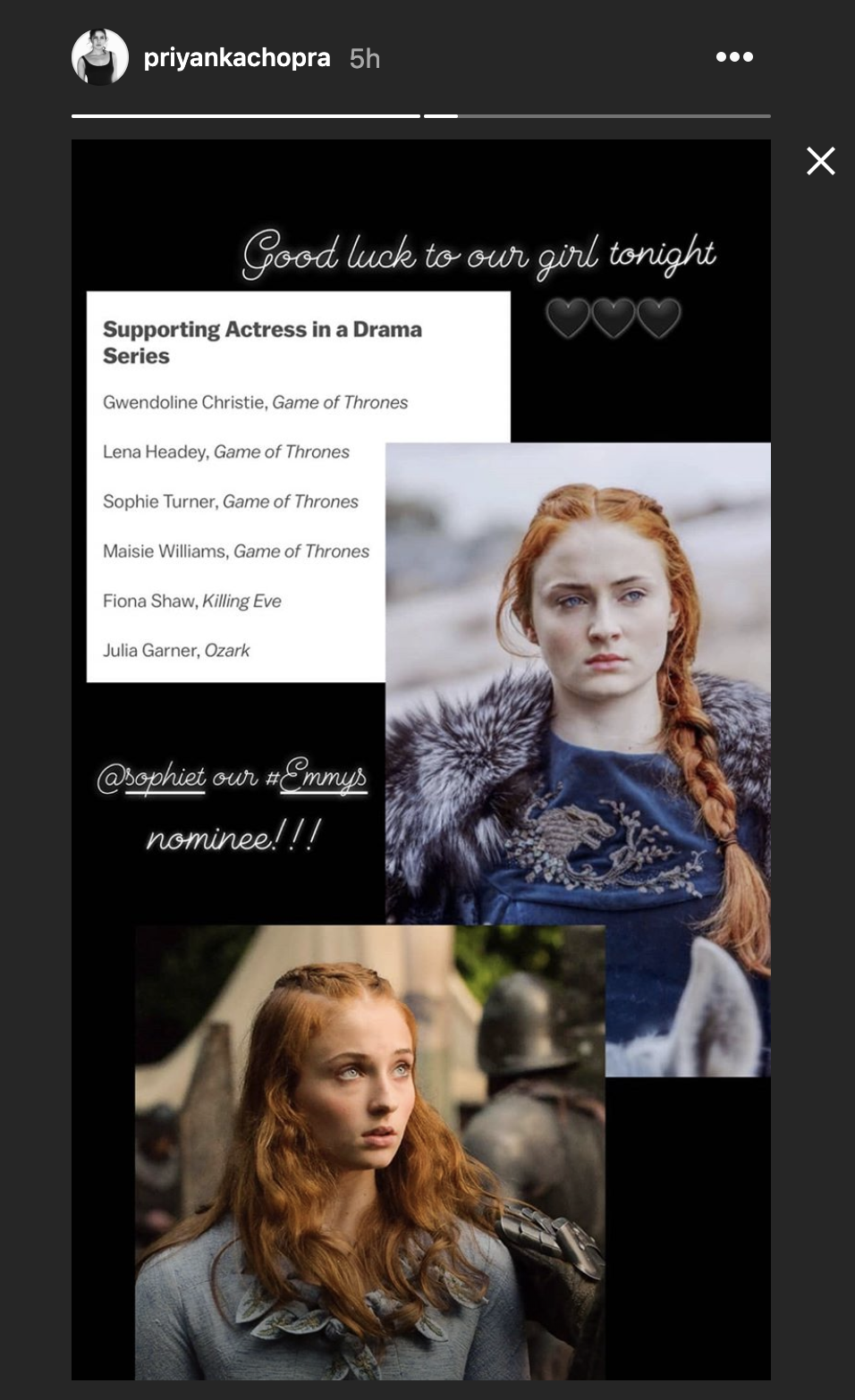 Paired with two photos of Sophie from the beginning of the show’s 8 seasons along with one from the end, Priyanka wrote, “Good luck to our girl tonight. @SophieT our #Emmys nominee.”