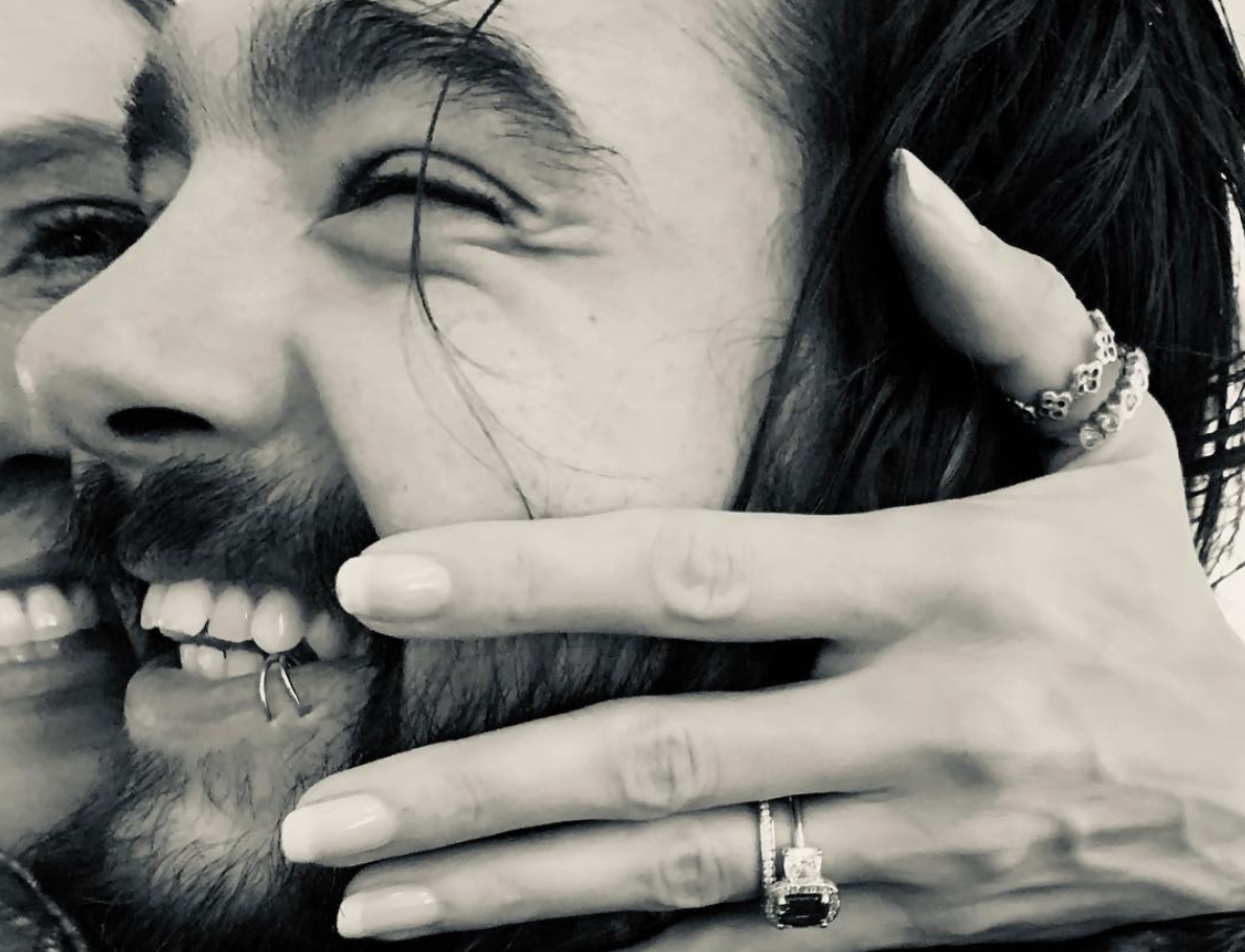 In the sweet black and white photo, Heidi is holding Tom’s face and showing off what appears to be a multi-stone engagement ring.