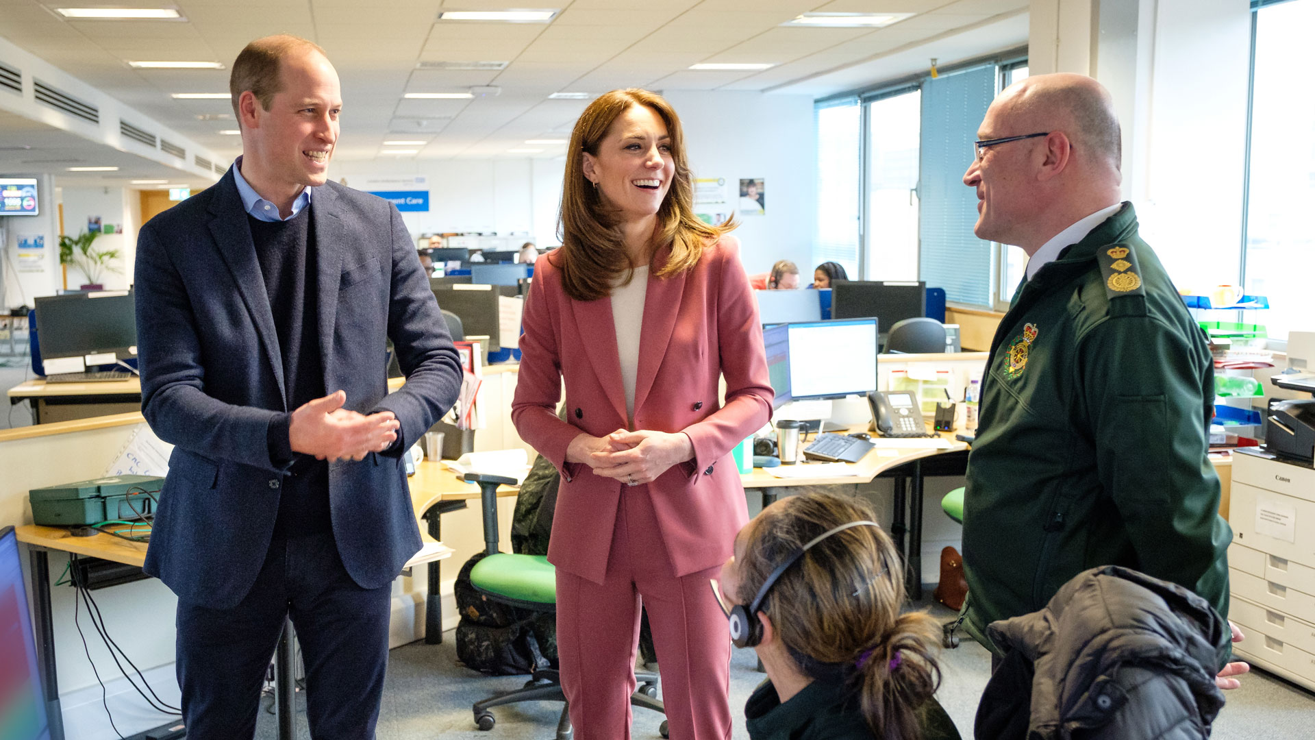 The couple’s official social media accounts and website shared photos from the visit, which showed Kate dressed in a fashionable pink pantsuit alongside her husband in a blue coat, as they spoke with frontline first responders.
