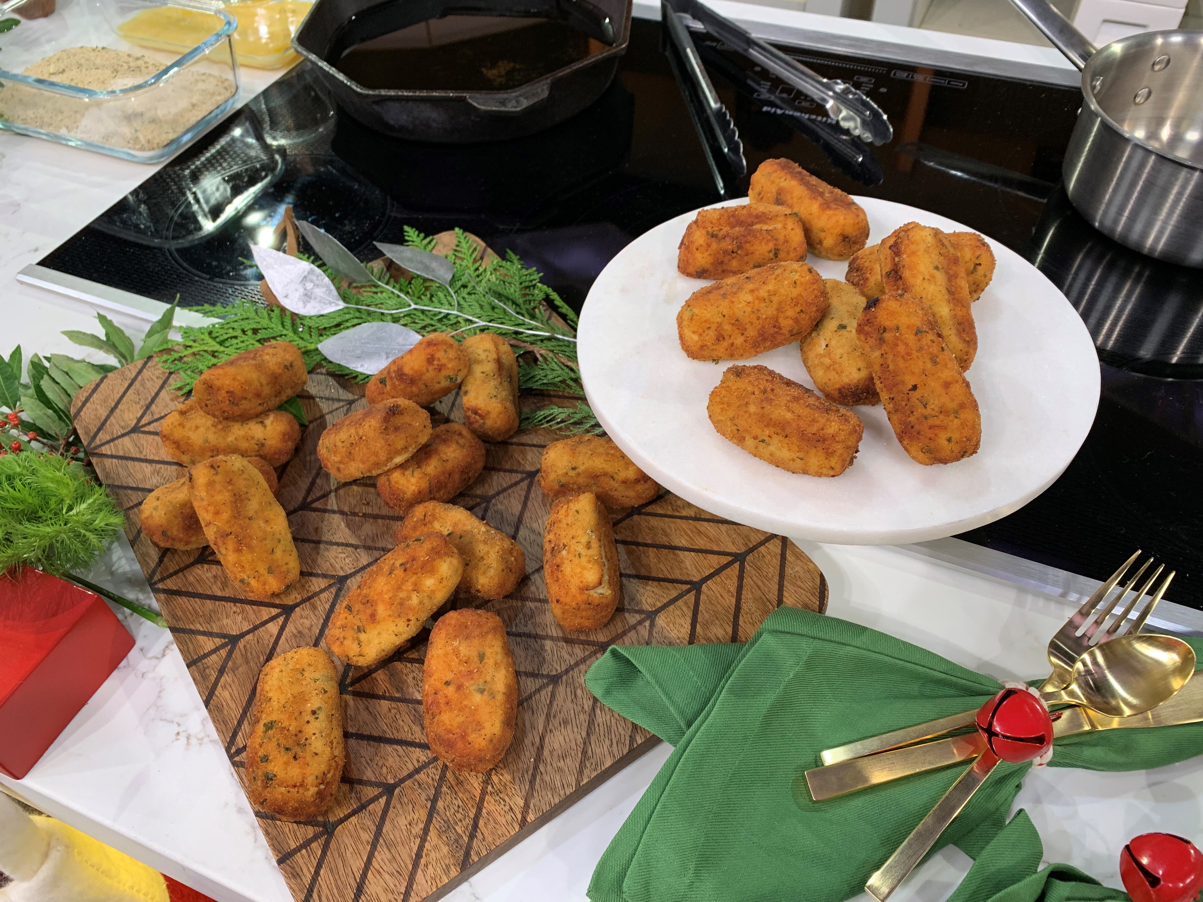 - In a deep skillet, heat about 1/2 inch of vegetable oil to 350°F – you’ll know it’s ready when you can drop in a bit of flour and it sizzles. Fry the croquettes in batches, rotating them on all sides until they are golden brown, 4 to 6 minutes total. As you go, transfer the fried croquettes to the prepared sheet pan and keep warm in the oven until all batches are done. Serve right away.