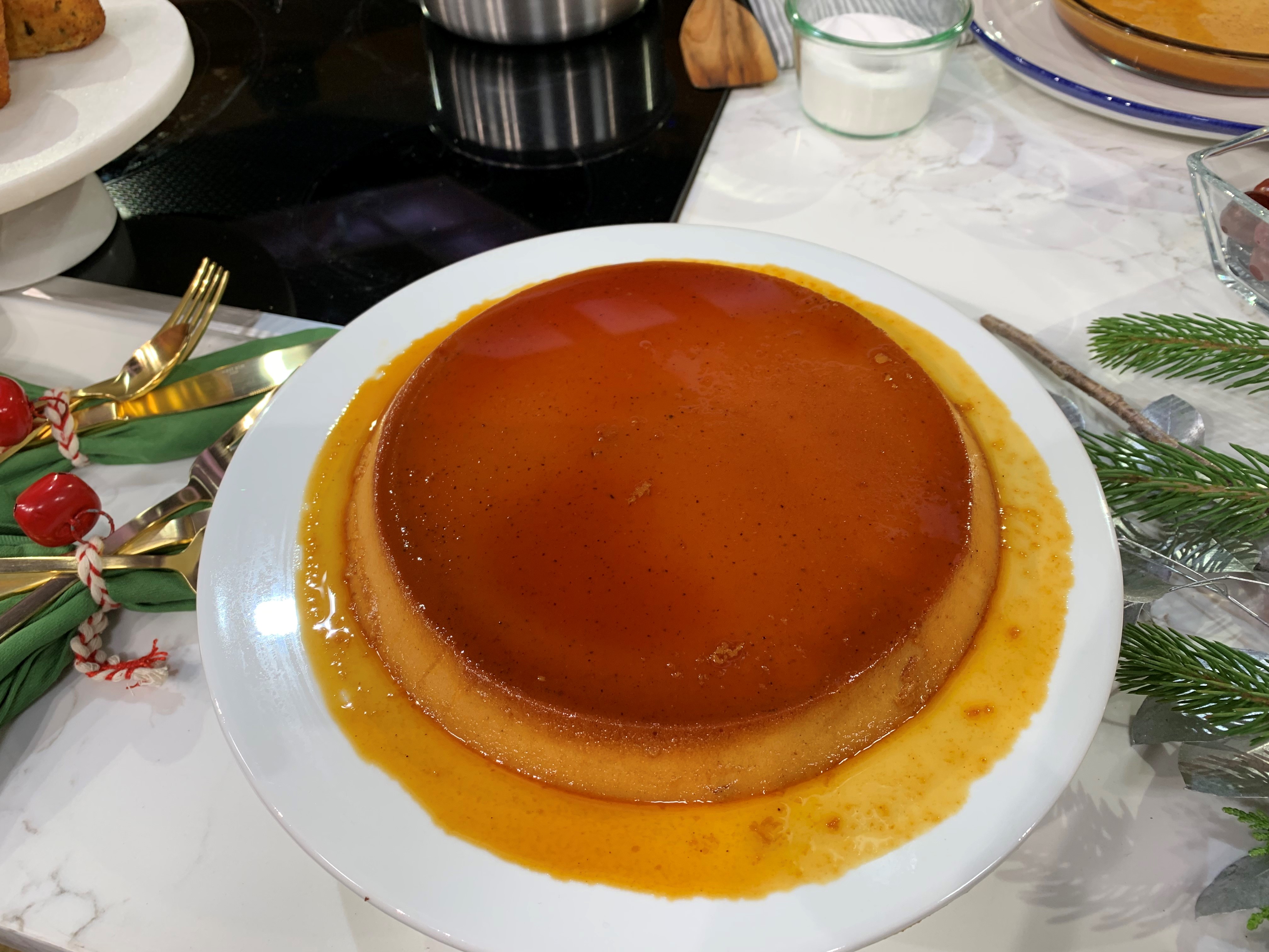 - To serve, take a large dessert platter and place it over the baking dish as if it were a lid. Do this over the sink to ensure no spillage. Quickly flip the pan and the platter together. The flan should come out of the baking dish perfectly, topped with a beautiful caramel glaze. Enjoy!